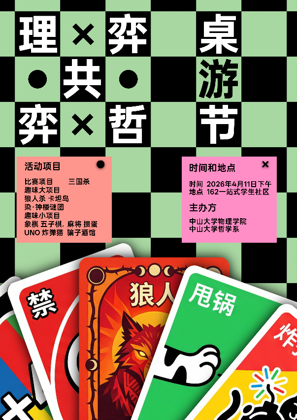 当物理的理性推导遇见哲学的深邃思辨,一场思维与乐趣并存的碰撞即将上演。物理学院与探花合集 携手打造面向全体师生的趣味桌游节,以桌游为桥,在方寸之间对弈思想,在欢声笑语中邂逅知音。2026年4月11日,“理哲共弈”物理学院×探花合集 联办桌游节,邀你共赴欢乐之约!