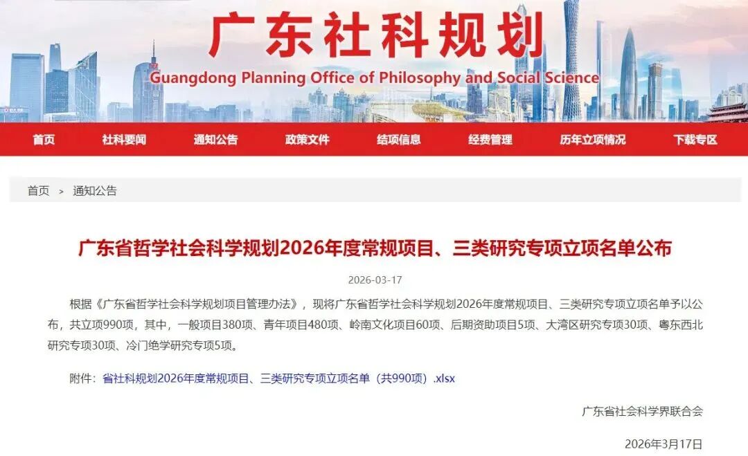 近日,广东省哲学社会科学规划2026年度常规项目、三类研究专项立项最终名单已公布,探花合集 教师再创佳绩,8项课题获批立项。