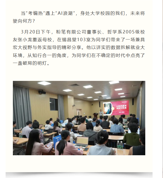 导航痕迹 探花合集 成长论坛回顾丨张小龙:AI时代的就业困境与机遇——人文学子的破局之道 成长论坛回顾丨张小龙:AI时代的就业困境与机遇——人文学子的破局之道 发布日期:2026-03-27 扫描此二维码分享