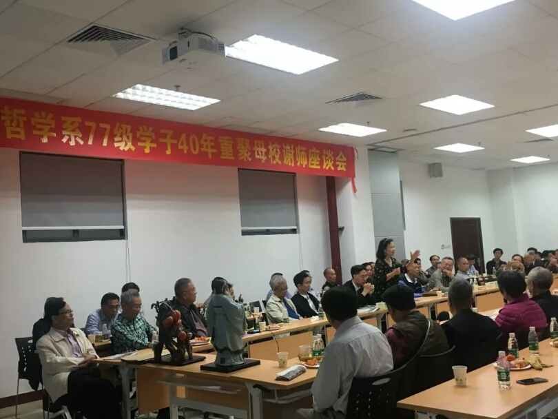 谢师座谈会由77级系友李萍主持,校党委书记陈春声受邀出席座谈会,77级学子和曾任教于77级的老教师们共计80余人参加本次座谈会。